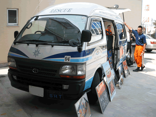 えっとですね。航空基地と特救基地が目と鼻の先にあってですね。帰りにこう特救基地の方見てみたらどうも人だかりできてるし、その中にオレンジ見えるし、行ってみたらち簡易展示会開いてくれてたんですよ。